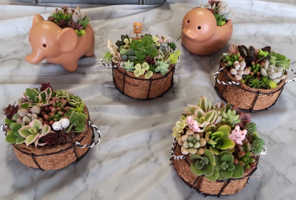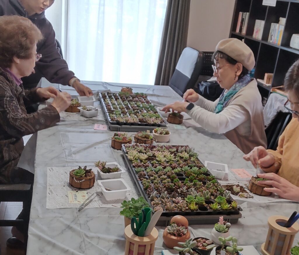 「多肉植物を楽しむ会」を開催しました。一面の多肉植物の苗を前にしたら、もうそれだけで可愛くて心が躍ります!その中からそれぞれ好みで苗を選び、寄せ植えをつくって行きました。あれもこれも入れたい!と色々詰め込んで、みんな盛り盛り。でもちゃんと可愛くて素敵な寄せ植えが出来上がりました♪多肉植物って色も形も触った感触も色々。香りの良いものもあり、五感も大いに刺激されました。管理の仕方や、多肉植物の性質なども教えていただいたので、大事に育てたいと思います。今回使った苗の栽培もされ、こよなく多肉植物を愛する講師の小倉さん、どうもありがとうございました!